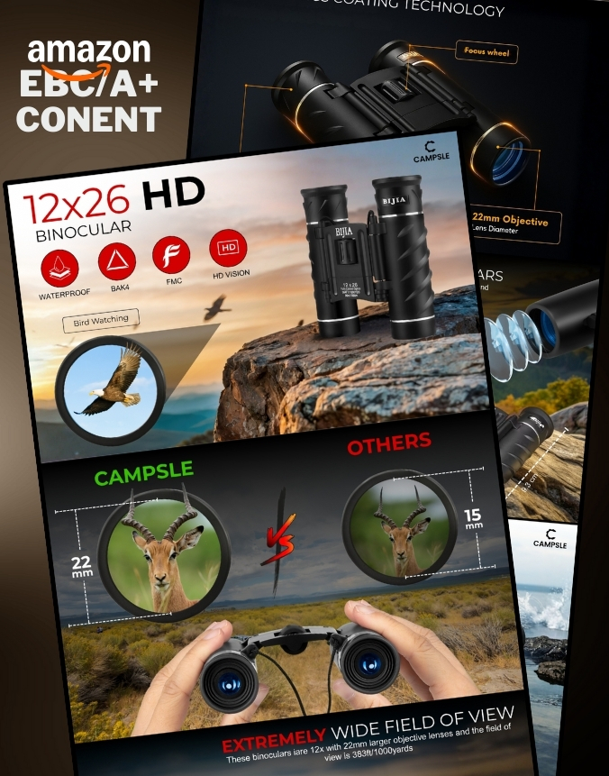 Bold, nature‑driven A+ layout that spotlights crisp BAK4 optics, 22 mm objective lenses and a wide field of view to entice outdoor enthusiasts.