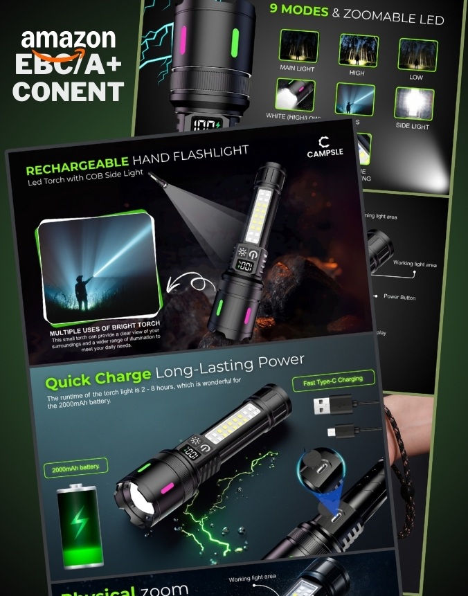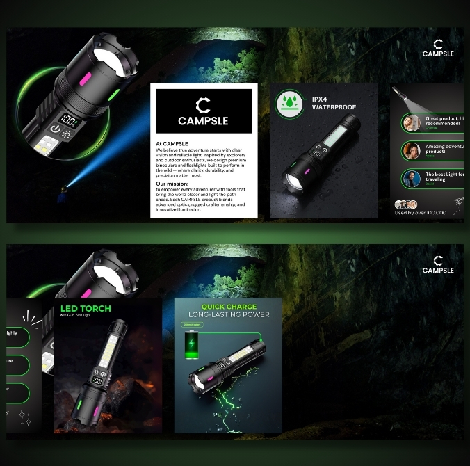 Dramatic, adventure‑ready A+ design blending dark backgrounds and clear diagrams to highlight nine lighting modes, zoom function and quick‑charge battery.