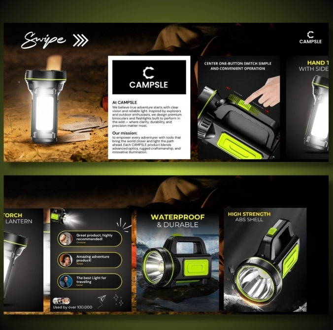 A campfire‑inspired tale showing a versatile lantern/torch that keeps campers safe and hands‑free with waterproof construction and long‑lasting battery life.