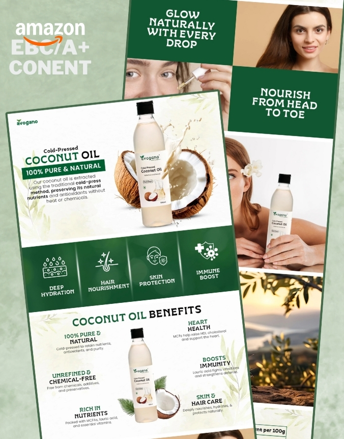 A fresh, plant‑based A+ layout combining tropical imagery and benefit icons to showcase deep hydration, hair nourishment, skin protection and immune boost.